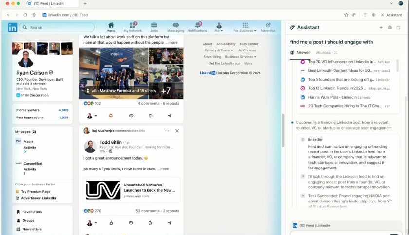 Here’s someone using Perplexity Comet to find posts to engage with on LinkedIn: filtering for certain posts to like, comment, and interact with