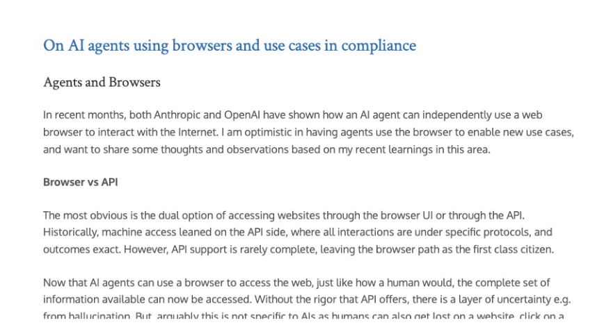Dongting Yu has a solid blog post here about using browser agents in compliance and security related fields: including concepts like an ai auditor, etc.