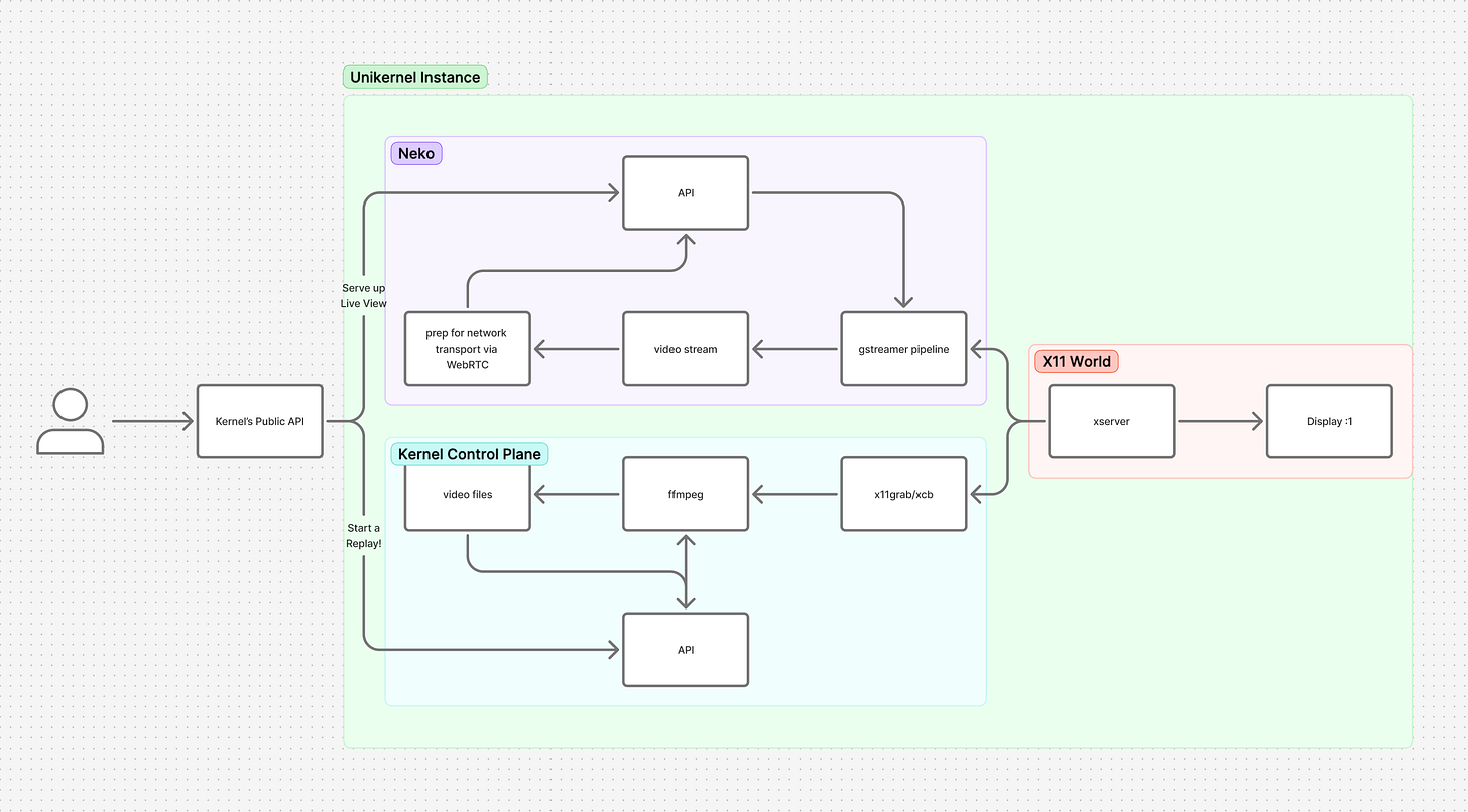 - When a user issues a replay command to Kernel’s user facing API, it’s delegated to the target unikernel, which manages the screen capture process.
