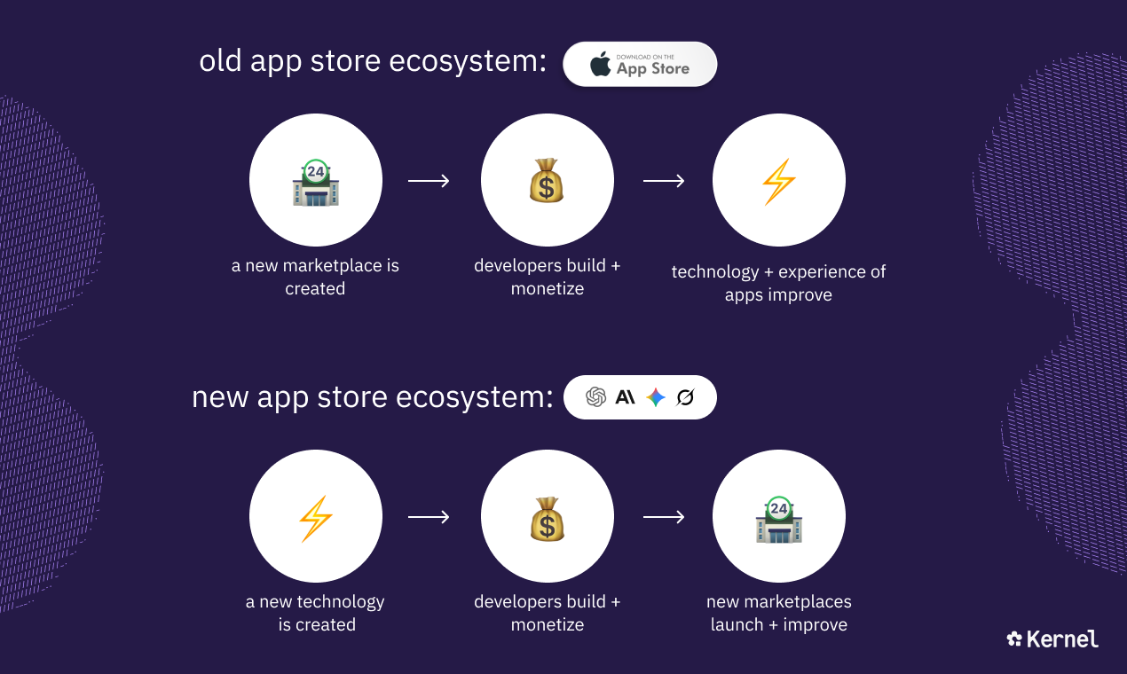 The ordering of things is different in this “app store.” At the moment, the technology is here first and the app stores and marketplaces will come later, whereas with the iphone launch the marketplace came first and the technology for each app improved over time. Yes OpenAi has a GPT storefront and other ai marketplaces exist. But we believe the true ecosystem still hasn’t fully emerged, yet. (and ..um.. no, we’re not building that just to clarify)